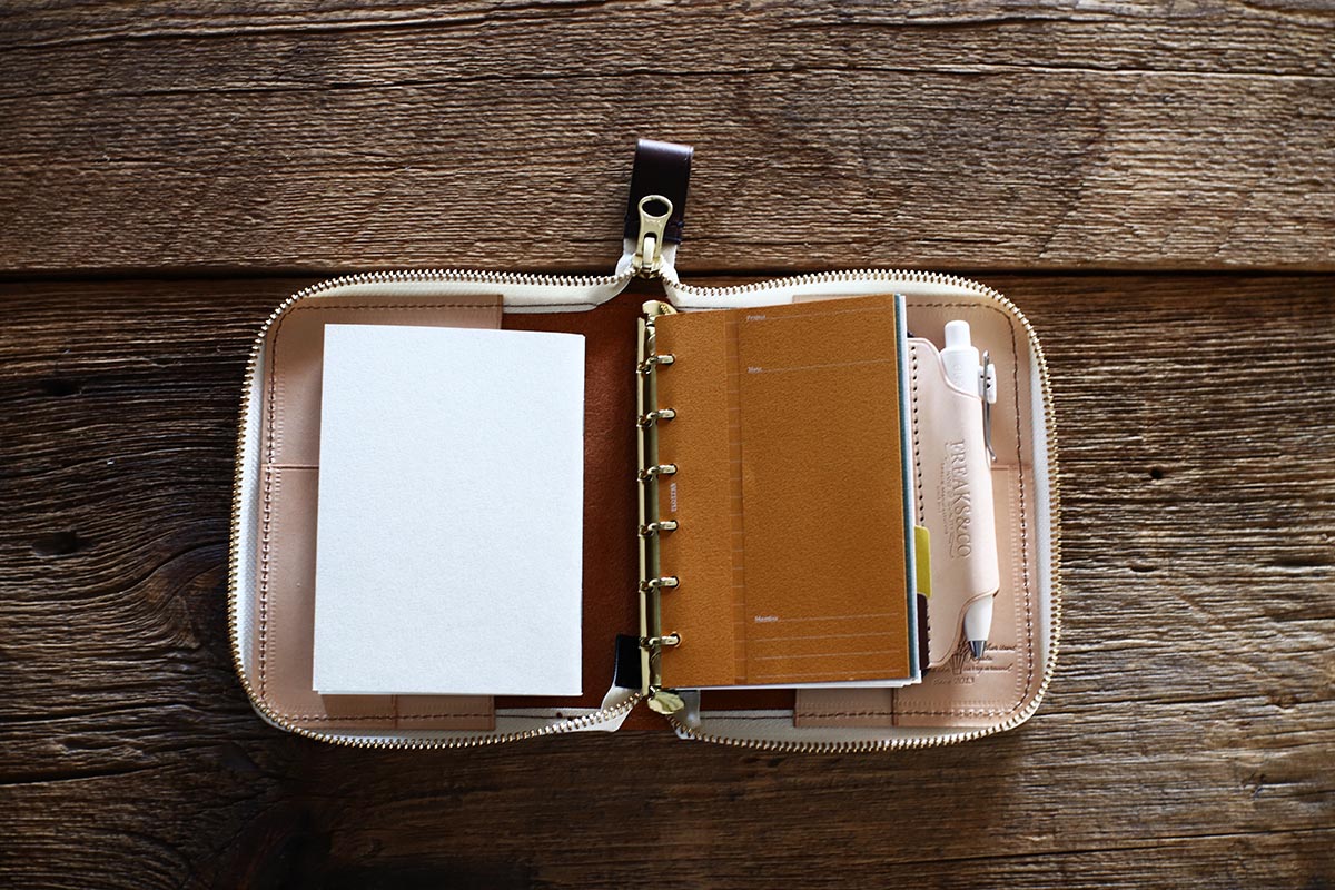 ラウンドファスナー式で、別売りのペンホルダー付きレザーリフィルも収まる実用的なサイズです。