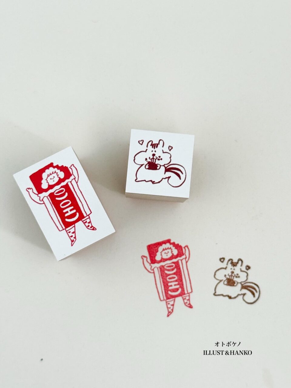 バラのスタンプ「もぐもぐクッキー」と2個セットスタンプ「チョコに夢中」の2種類です。