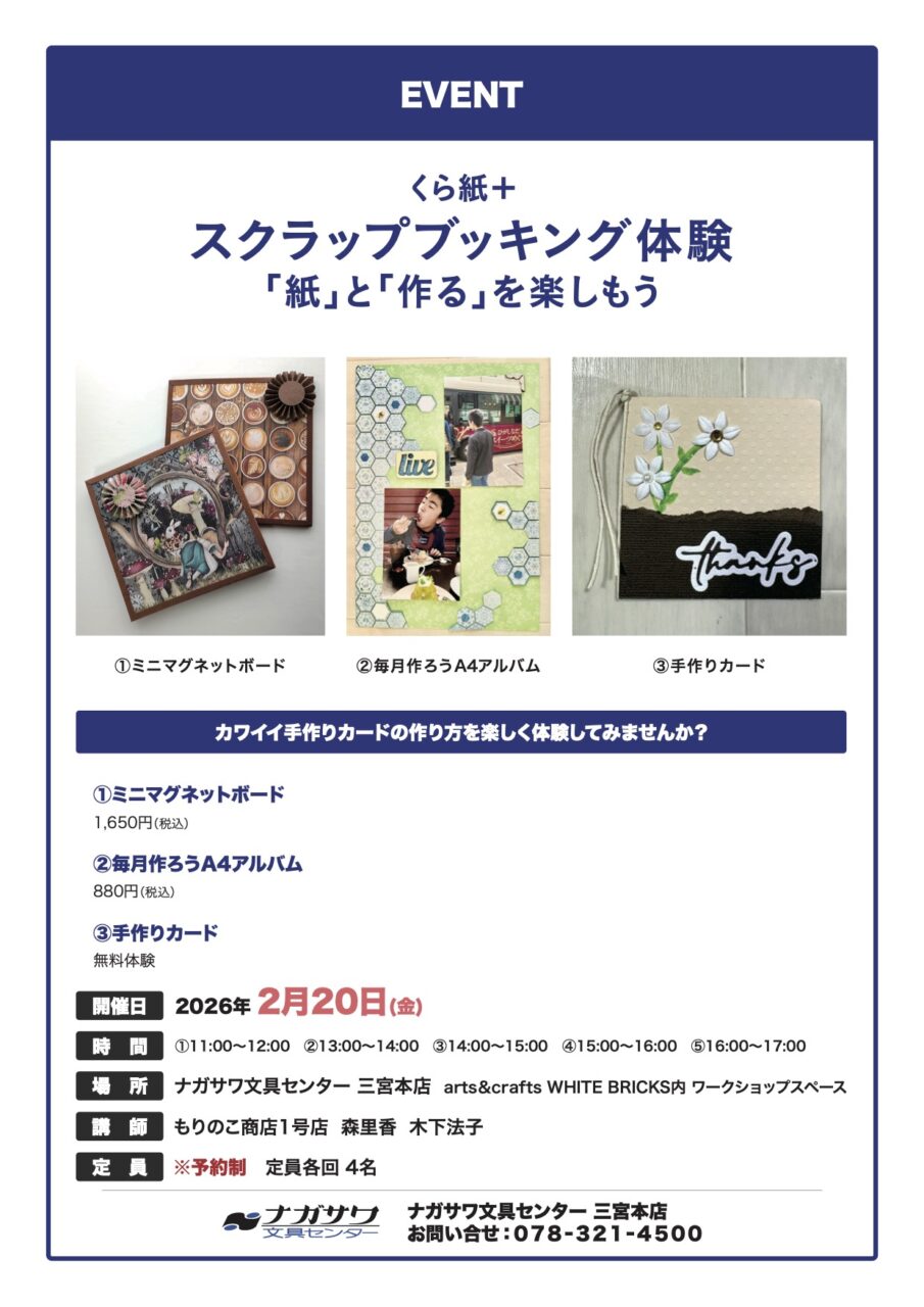 2026年2月20日(金)くら紙+スクラップブッキング体験「紙」と「作る」を楽しもうナガサワ文具センター 三宮本店