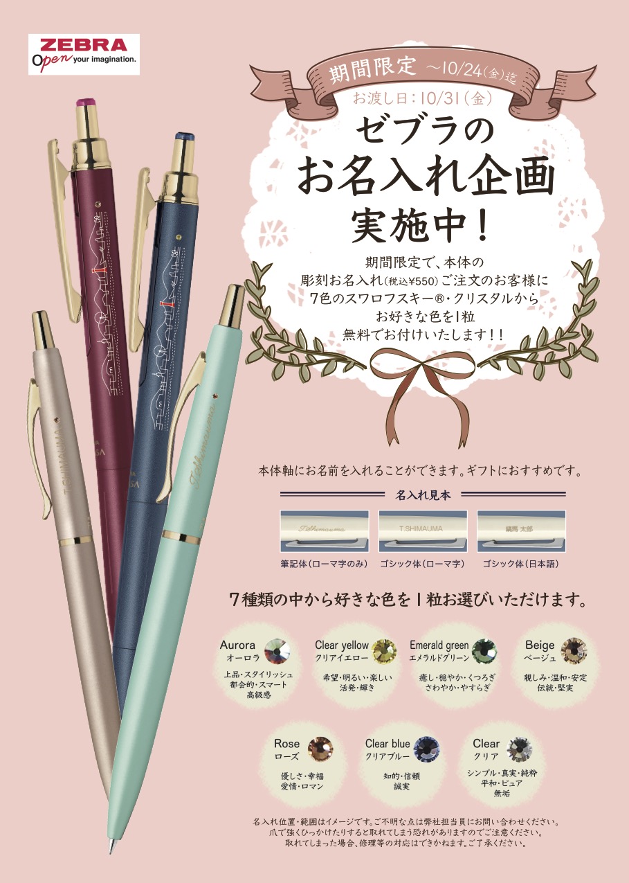 ゼブラの指定ボールペンご購入、名入れ申し込みで7色のスワロフスキークリスタルから1つ無料でお付けします。