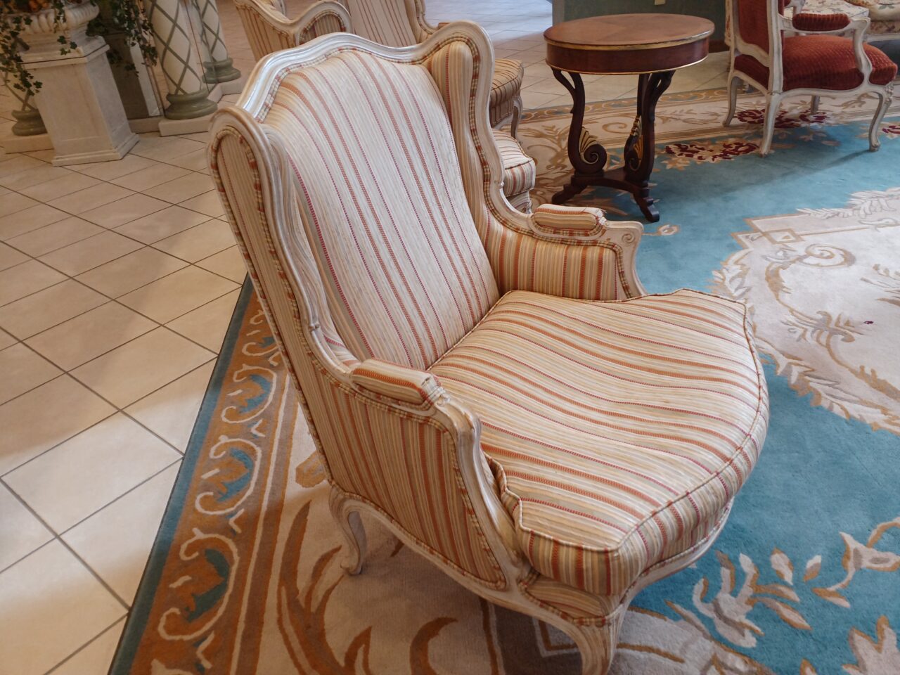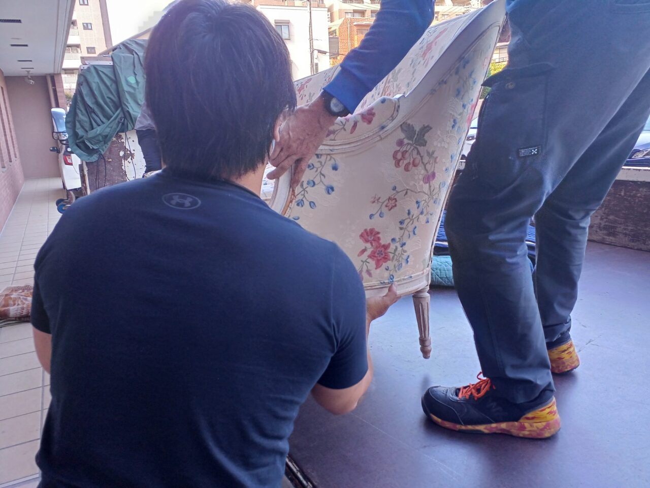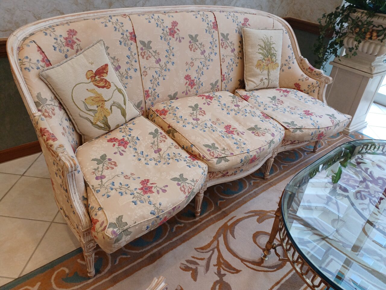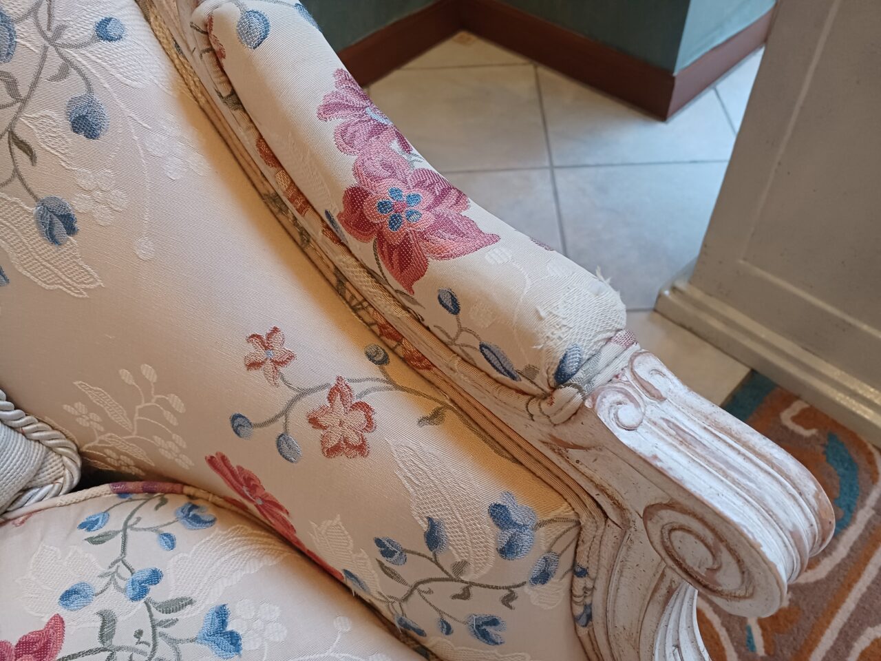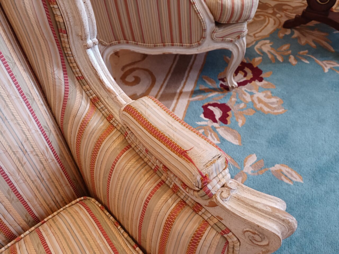 2006年の開設時に導入されたらしいアンティーク調のイスやソファの生地に経年劣化が目立ったことで、生地の張り替えの相談をいただきました。