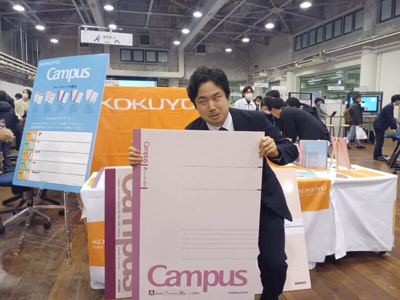 特大Campusノートですね。発売から現モデルまでの特大サイズのパネルが置いてあり、「あなたの使ったCampusノートはどれ?」というアンケートをやっていました。写真の森君のように楽しくて変顔してしまう人もいるかもしれませんね(笑)