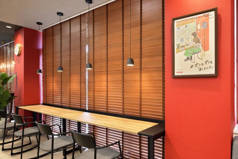 奥にある長期滞在エリアにはあえていろいろな椅子を採用。