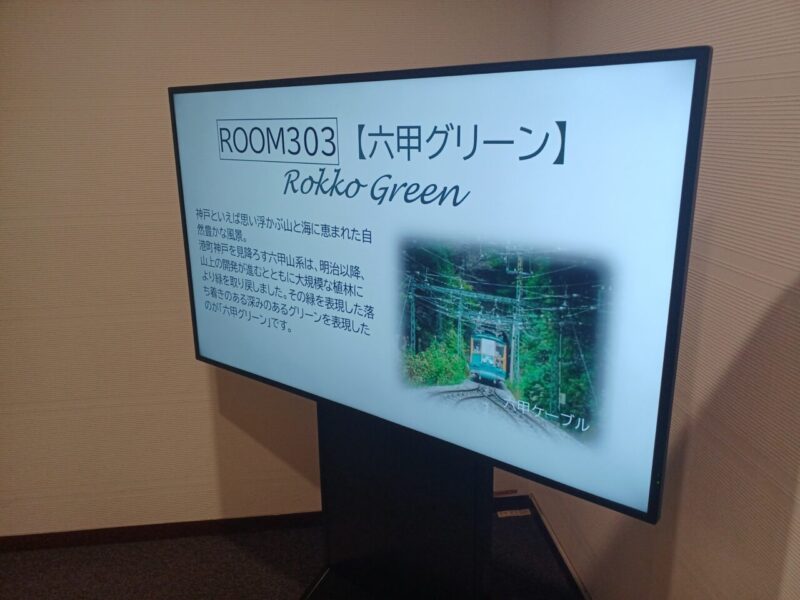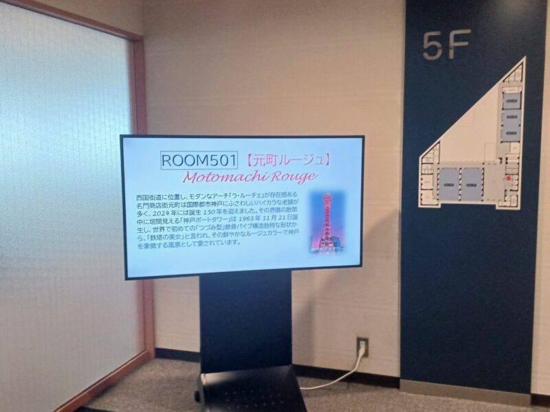 会議室各フロアエレベーター前にはフロア内の会議室に割り当てている神戸INK物語の説明をサイネージにて案内しております。