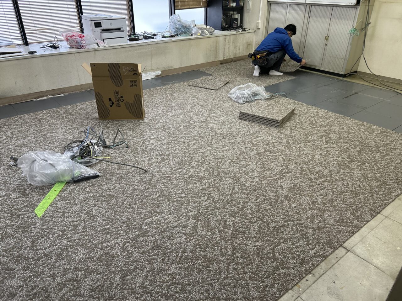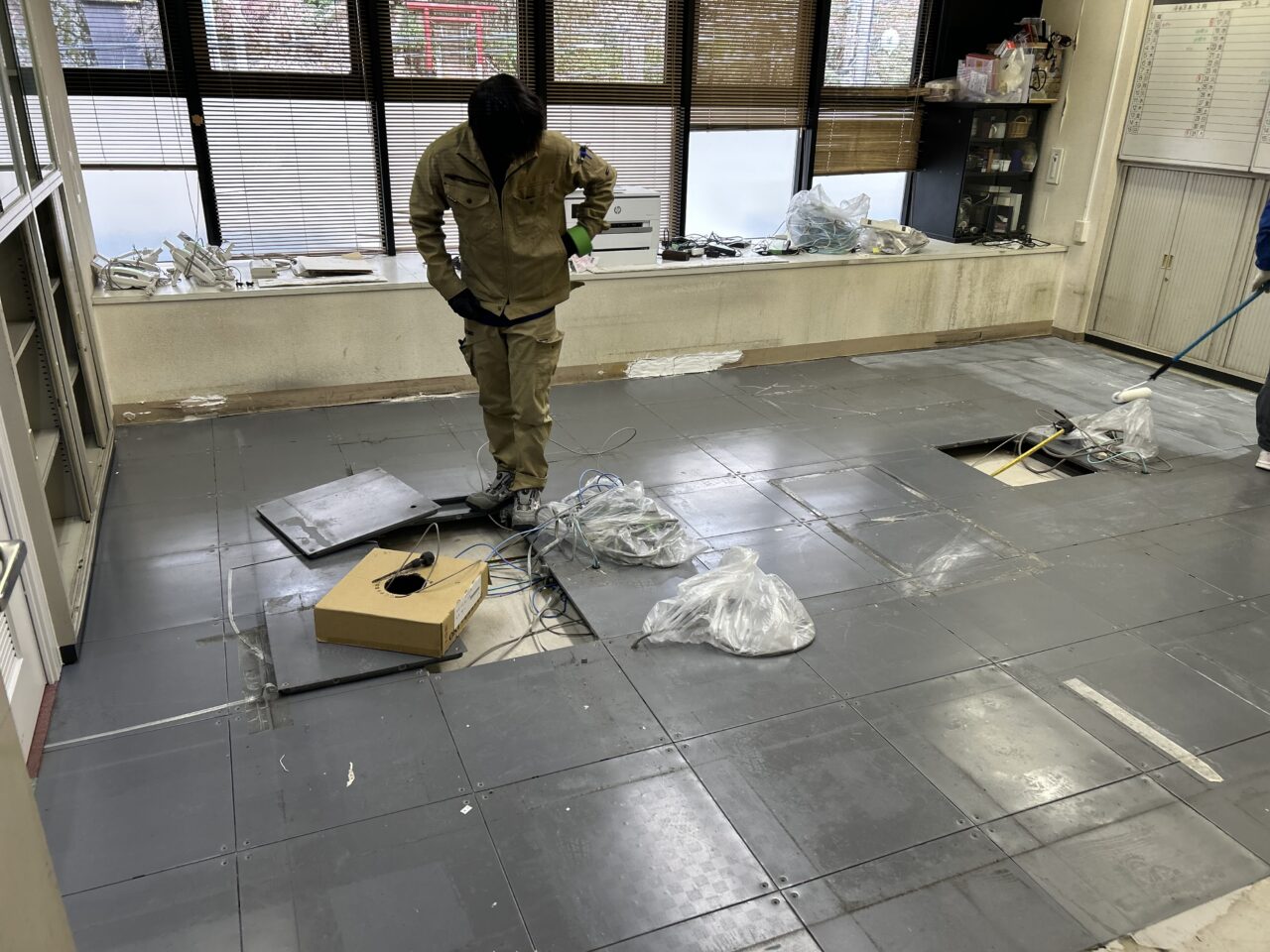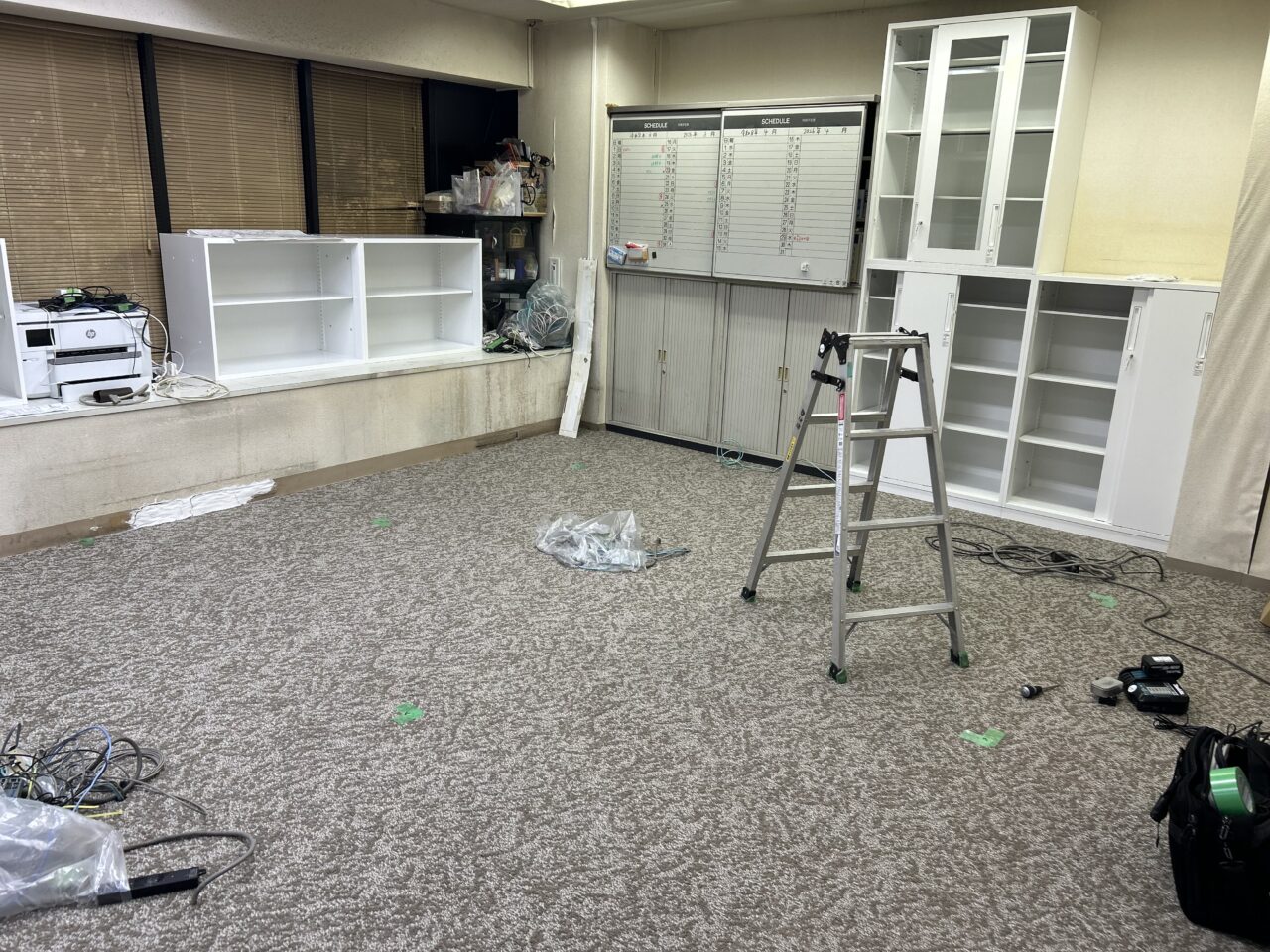 1日目に備品の搬出、配線の調査とまとめ、カーペット施工を