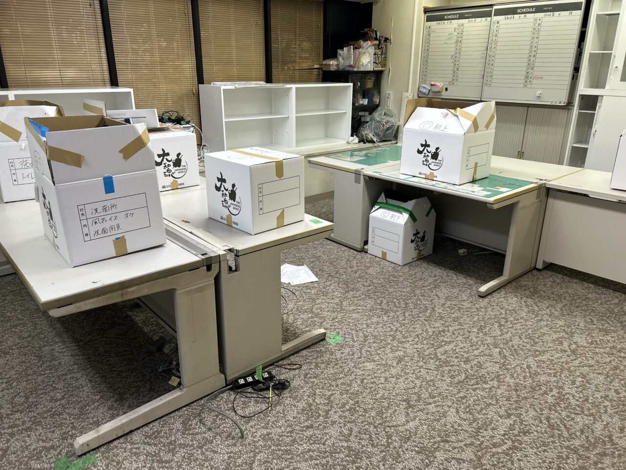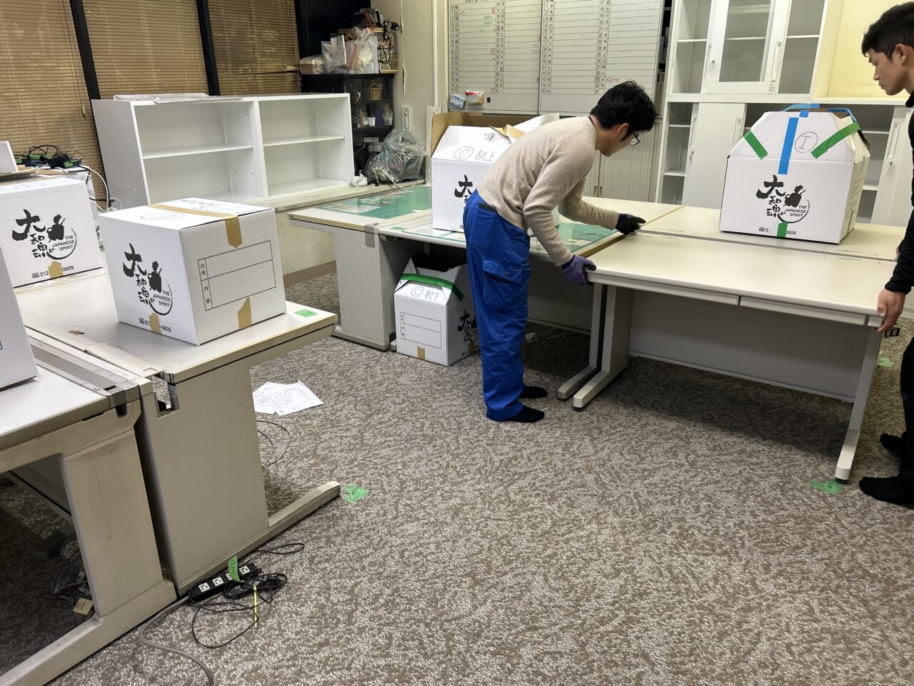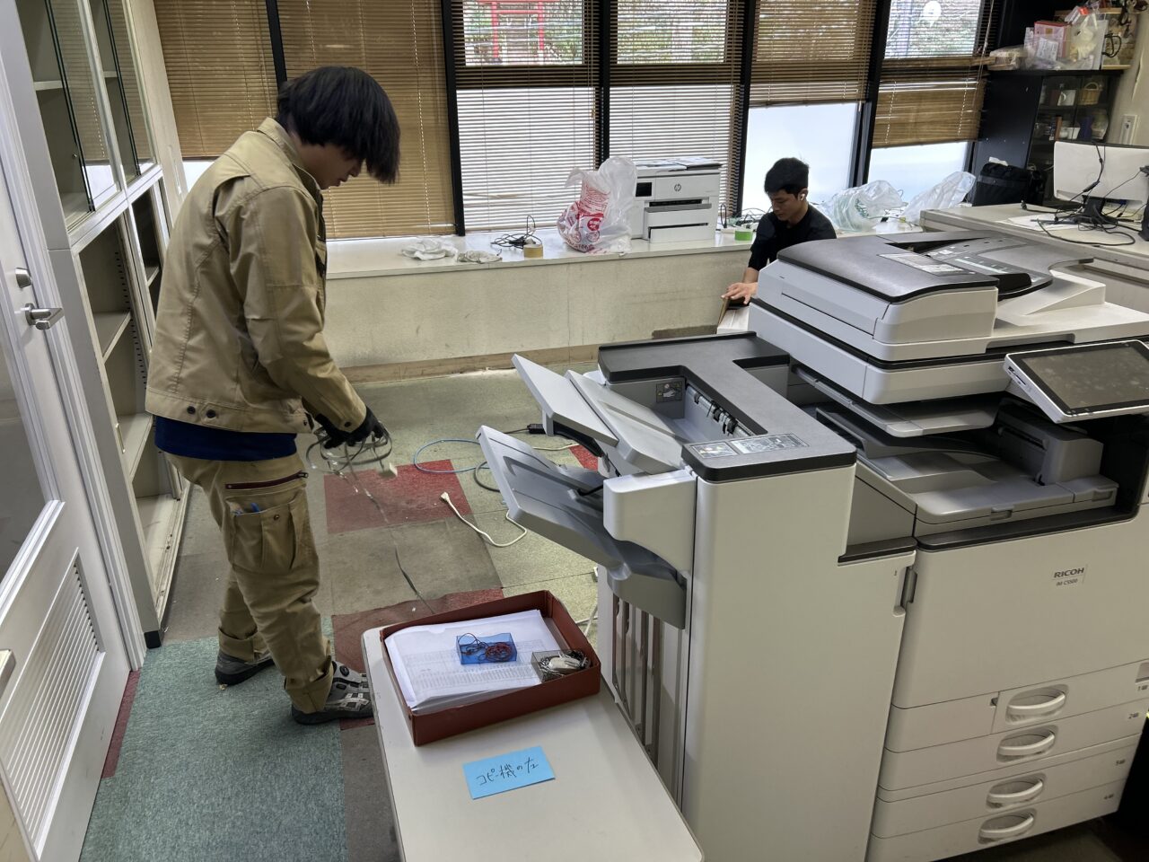 1日目に備品の搬出、配線の調査とまとめ、カーペット施工を