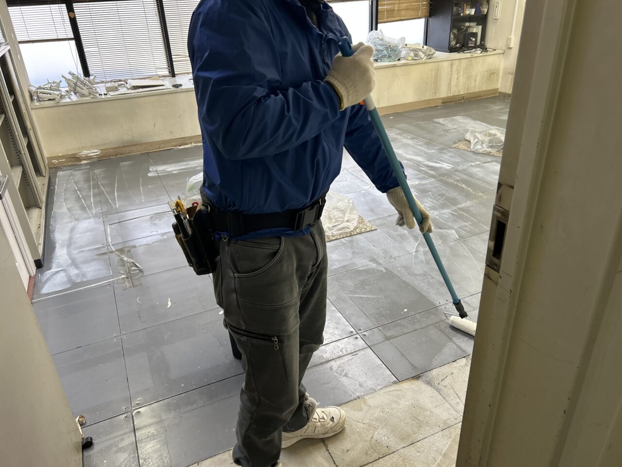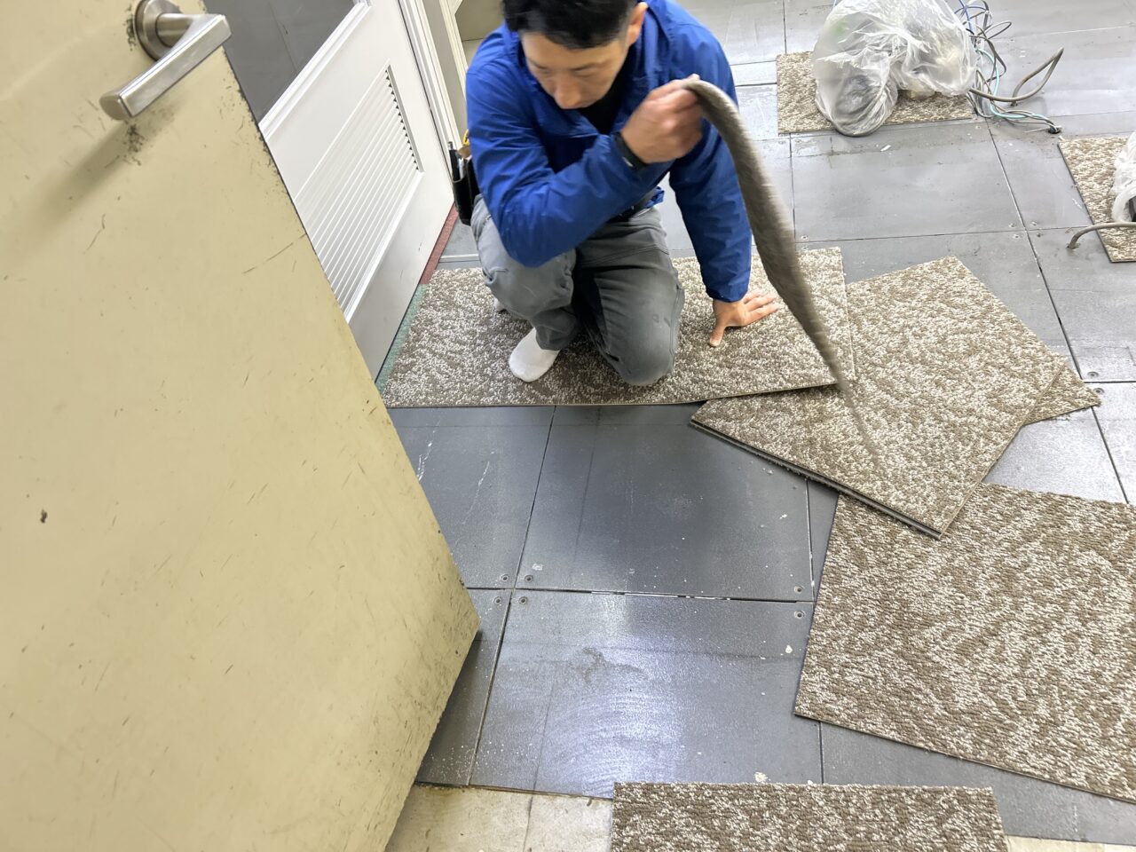 搬出が終わると、配線まとめをするそばでカーペットをはがし