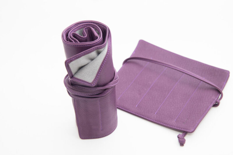 また筆記具に直接触れる裏地にはウルトラスウェードのライトグレーを、ステッチは革と同色の紫でシンプルに仕上げ、飽きの来ない長くお使いいただける一品に仕上げました。